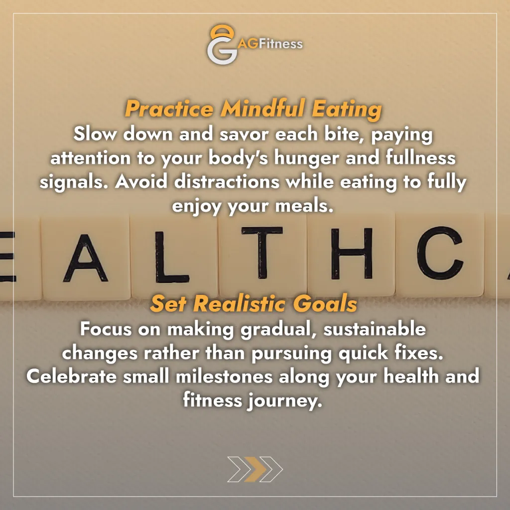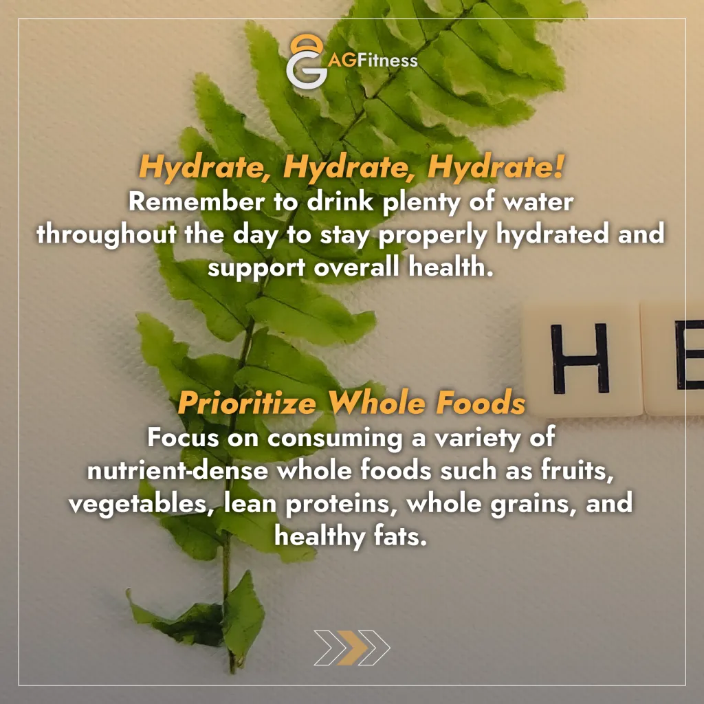 Discover essential nutrition tips for a healthy lifestyle with AG Fitness Dubai. Learn about hydration, whole foods, mindful eating, and self-care.