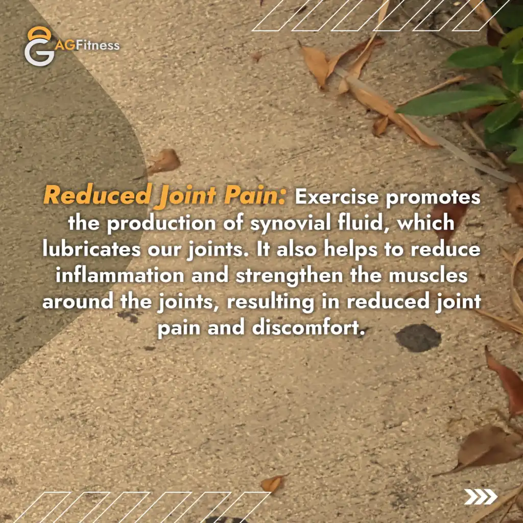 Reduced Joint Pain: Physical activity stimulates the production of synovial fluid, which naturally lubricates our joints. It also helps reduce inflammation and strengthens the muscles around the joints, leading to less discomfort and improved joint function.